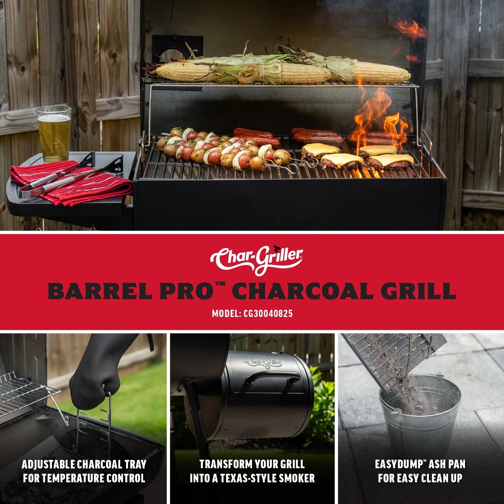 Take your charcoal grilling game to new heights with Char-Griller's Barrel Pro Charcoal Barrel Grill. Savor the unbeatable flavor of charcoal cooking while experiencing easy temperature control with the adjustable charcoal tray and dual damper design to unlock bold smoke-infused flavors. Designed with Char-Griller's seriously hardworking features like the EasyDump™ Ash Pan for easy cleanup, coated cast iron cooking grates to seal in delicious food flavor or the side shelf for additional food preparation space, get everything you need in a traditional charcoal barrel grill with the Walmart exclusive Barrel Pro Charcoal Grill.