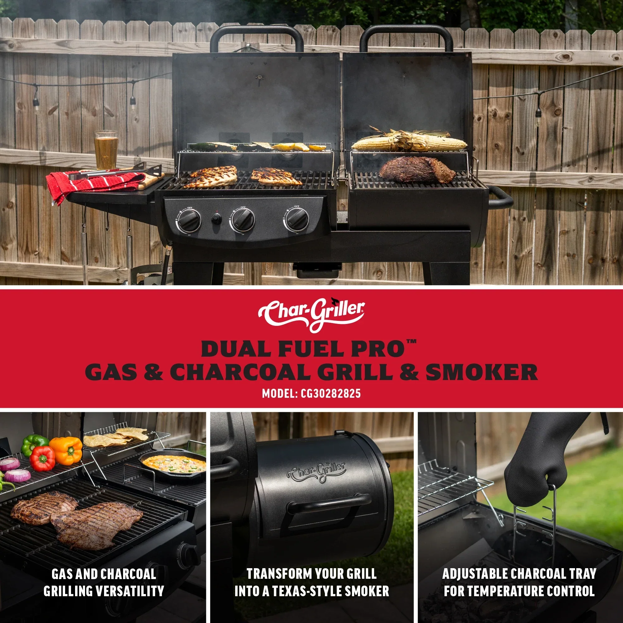 Get two popular styles of outdoor cooking in one with the Char-Griller's Dual Fuel Pro™ 3-Burner Gas and Charcoal Grill and Smoker. Whether you're craving the rich, smoky flavor of charcoal for weekend cookouts or opt for a quick and convenient weeknight flame-fired meal, achieve ultimate bbq cooking versatility with this charcoal and gas grill combo. With 33,000 BTU's of propane output, get all the power you need to easily grill up your favorite foods in the comfort of your backyard. Get a propane grill and charcoal grill in one with the Duel Fuel Pro Gas and Charcoal Grill and Smoker.