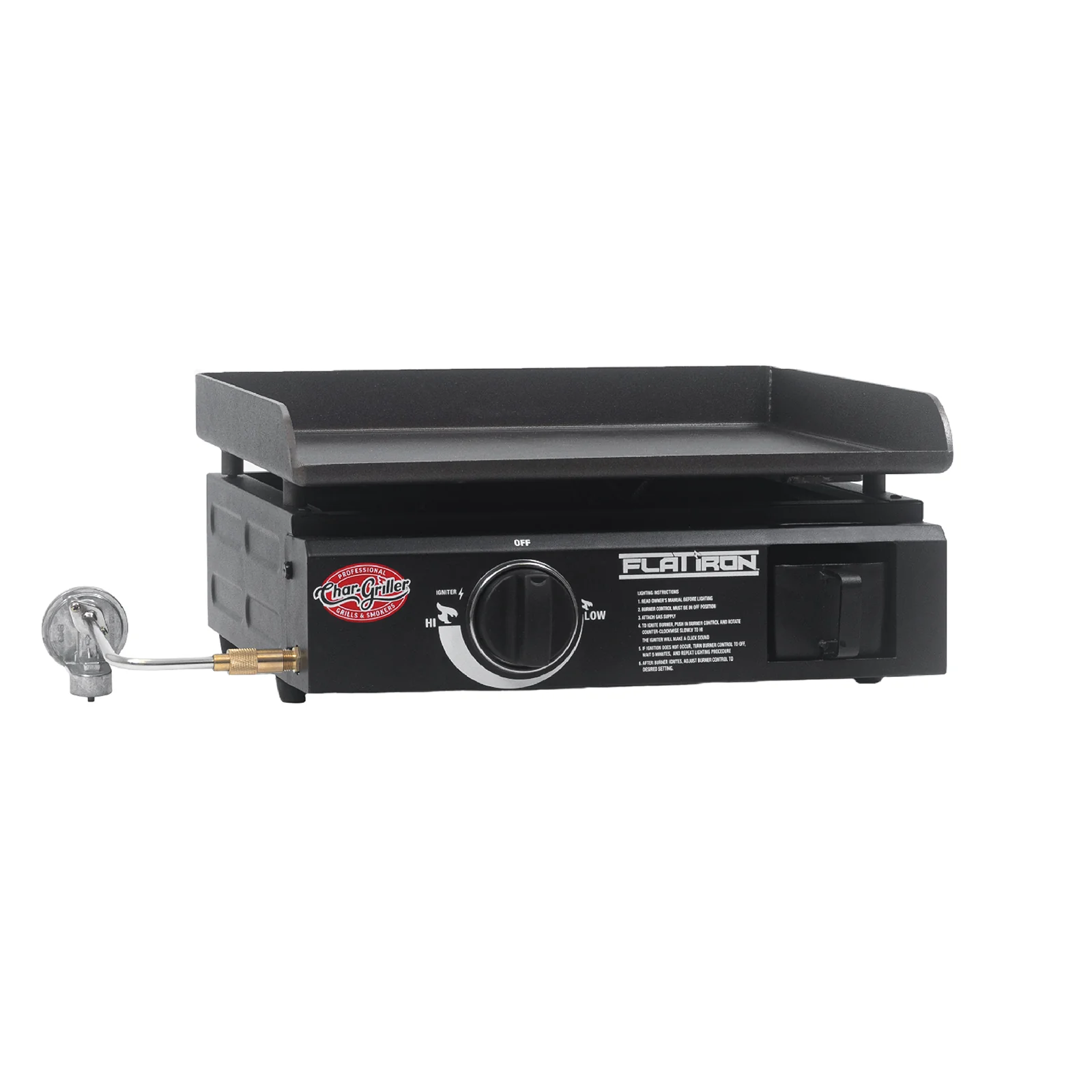 Take your griddle on-the-go with the Char-Griller Flat Iron Portable Gas Griddle with the Universal Table Top Stand. With the ability to sear and sauté your favorite foods, this griddle offers one gas burner providing 12,000 BTU of output with wind guards to ensure you can maintain your desired cooking temperature without losing heat. Electronic ignition, easy-to-use burner control knobs and a removable grease tray ensure your portable griddle cooking experience is seamless and enjoyable. The stand is portable and easy to break down and gets your griddle off the ground so you can easily and safely cook with it. From burgers to breakfast, serve up your favorite foods for the whole family to enjoy.